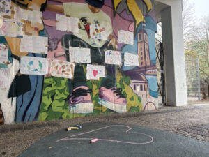 Trotz grauem Himmel und sporadischer Regenschauer versammelten sich vor allem Kinder und Jugendliche rund um den Gemeinwesenverein Heerstraße Nord e.V., um ihre Osterferien kreativ zu nutzen. Mit Kreidezeichnungen, expressiven Schriftzügen und pointierten Statements verwandelten sie Böden und Wände in lebendige Ausdrucksflächen. Auch wenn die Protestbotschaften vergänglich sind, bleibt der Appell bestehen.